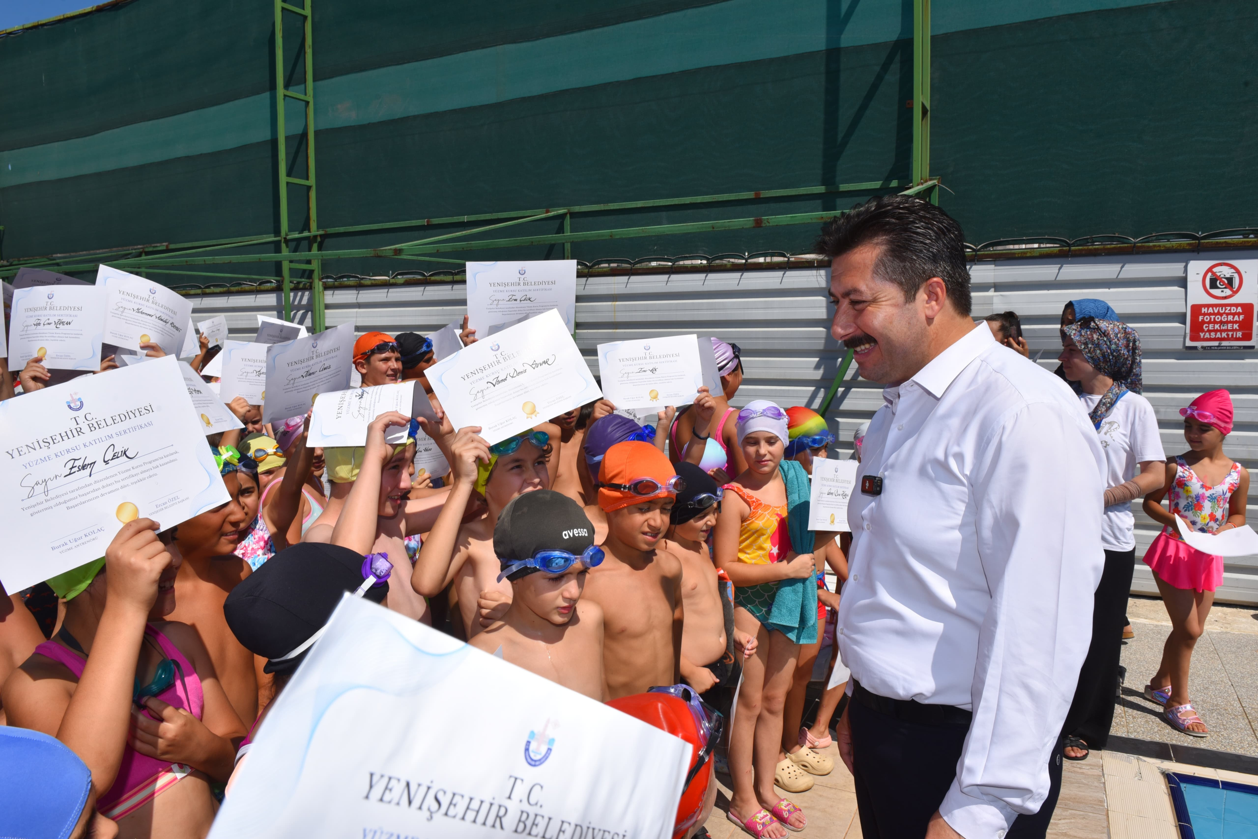 Yenişehir Belediyesi tarafından düzenlenen yaz dönemi yüzme kurslarını başarıyla tamamlayan 380 öğrenci sertifikalarını Belediye Başkanı Ercan Özel’in elinden aldı.