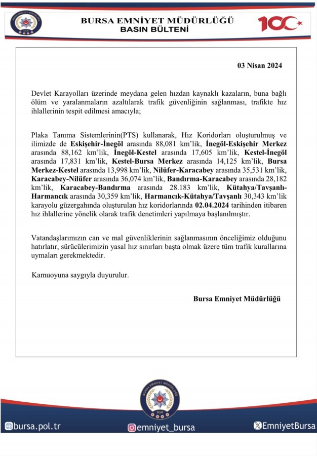 Bursa İl Emniyet Müdürlüğü sürücüleri hız kontrolleri ve yeni oluşturulan hız koridorlarına karşı uyardı. Mart ayının başından itibaren hız kurallarına uymayanlara cezalar yazılmaya başlandı.