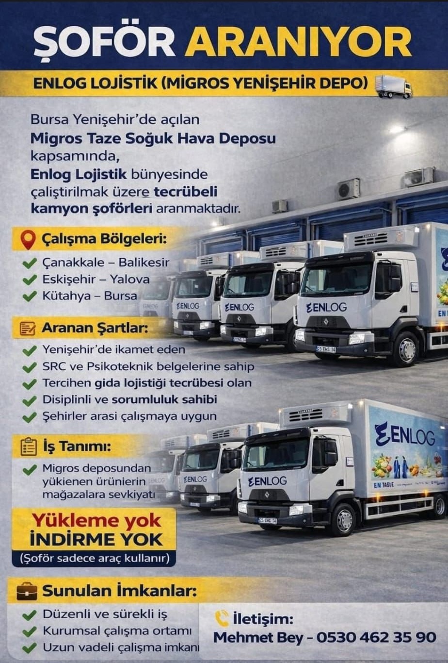 Önceki gün bir dostum bir ilan gönderdi. İlanı yazı ile birlikte paylaşacağım sizlerle. Özet olarak, İstanbul merkezli ENLOG lojistik firması Migros Yenişehir deposu için şoför ilanı vermiş. İlanda, Migros Yenişehir depodan Türkiye’nin çeşitli illerine yaş sebze meyve nakliyesi yapılacak ve şoförlerden Yenişehir’de ikamet etme şartı aranıyor. Yani sözü uzatmadan Migros Yenişehir’e yaptığı devasa tesisin nakliye işini İstanbul merkezli bir firmaya vermiş, bu firmada Yenişehirli şoförleri az bir para ile çalıştıracak Yenişehirli iki tane taşıyıcılar kooperatifi gelen geçen kamyon ve tırları izleyecek.