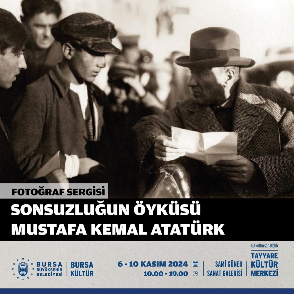 Bursa Büyükşehir Belediyesi tarafından 10 Kasım Atatürk’ü Anma Haftası kapsamında hazırlanan ‘Sonsuzluğun Öyküsü-Mustafa Kemal Atatürk’ fotoğraf sergisi, 6 Kasım Çarşamba günü Tayyare Kültür Merkezi’nde ziyarete açılacak.