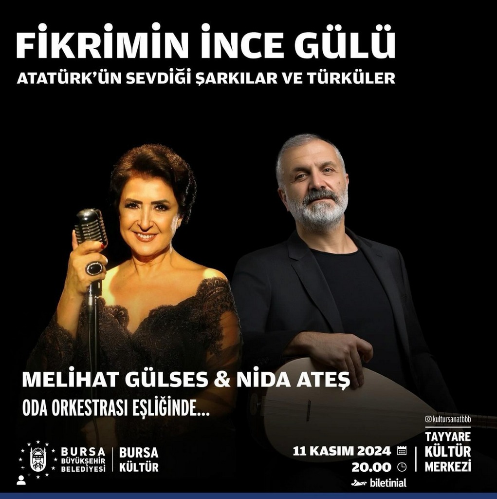 Bursa Büyükşehir Belediyesi, Ulu Önder Mustafa Kemal Atatürk’ün vefatının 86’ncı yıl dönümünde 10 Kasım Atatürk’ü Anma Haftası kapsamında birbirinden zengin içerikli programlar düzenliyor. Programlar kapsamında hazırlanan ‘Sonsuzluğun Öyküsü-Mustafa Kemal Atatürk’ fotoğraf sergisi, 6-10 Kasım tarihleri 10.00-19.00 saatleri arasında Tayyare Kültür Merkezi Sami Güner Sanat Galerisi’nde ziyaret edilebilecek. Ayrıca Orkestra Şube Müdürlüğü tarafından 10 Kasım Pazar günü Saat 20.30’da Tayyare Kültür Merkezi’nde ‘Ölümsüzlüğe Ezgiler-Bir Fırtına Tuttu Bizi’ adlı konser düzenlenecek. Etkinlikler kapsamında 11 Kasım Pazartesi günü Saat 20.00’da Tayyare Kültür Merkezi’nde ‘Fikrimin İnce Gülü’ adlı konser düzenlenecek. Atatürk’ün sevdiği şarkılar ve türkülerin seslendirileceği gecede, Melihat Gülses ve Nida Ateş sahne alıyor.