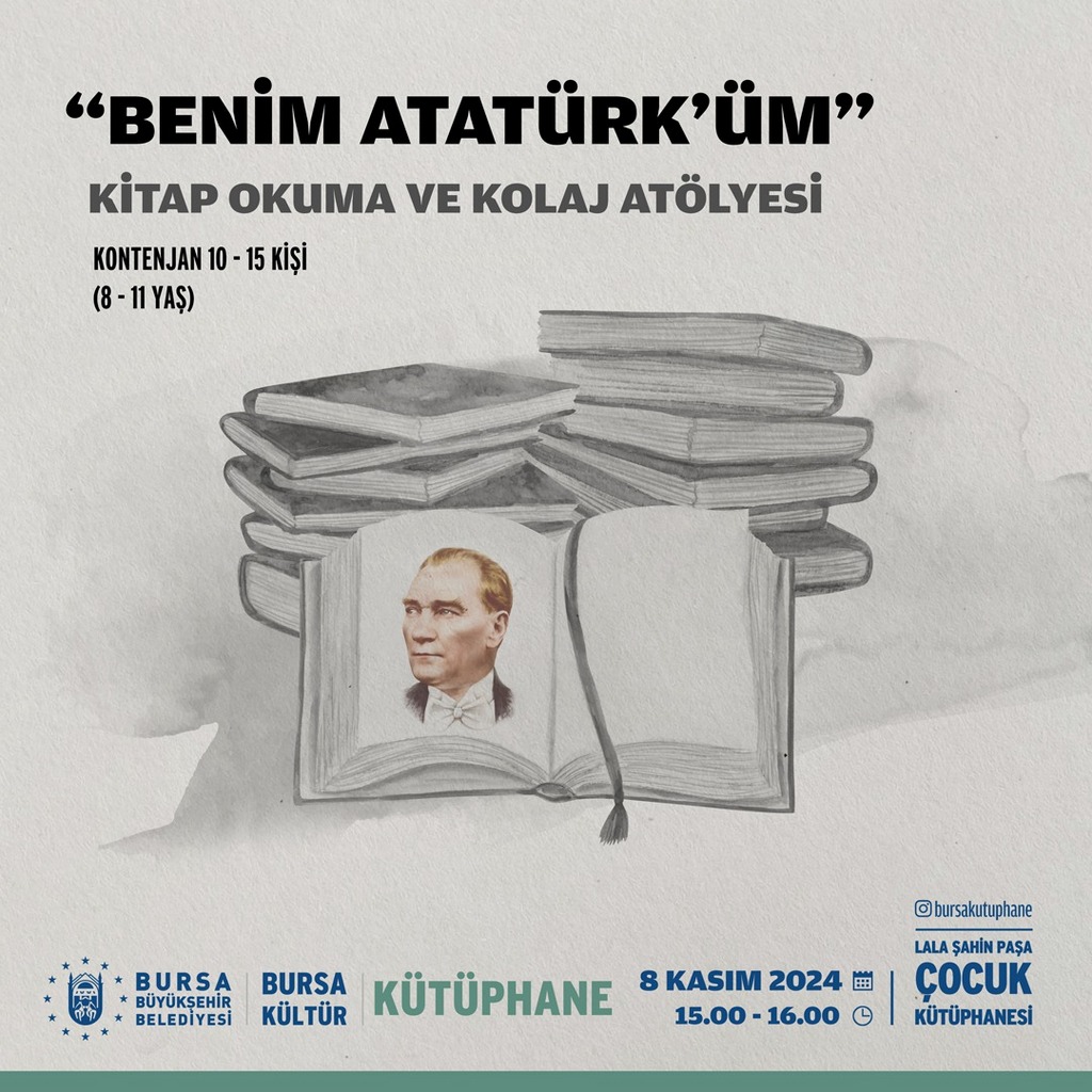6 Kasım 2024 Çarşamba günü saat 15.00-16.00 saatleri arasında ise Lala Şahin Paşa Çocuk Kütüphanesi’nde ‘Benim Atatürk’üm’ adlı kitap okuma ve kolaj atölyesi düzenleniyor.