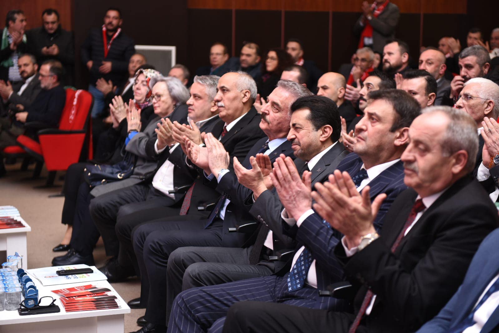 Alkışlarla kürsüye çıkan Belediye Başkanı Davut Aydın, 2014-2019 yılları arasında yaptığı projeleri ve yeni dönemin projelerini paylaştı.