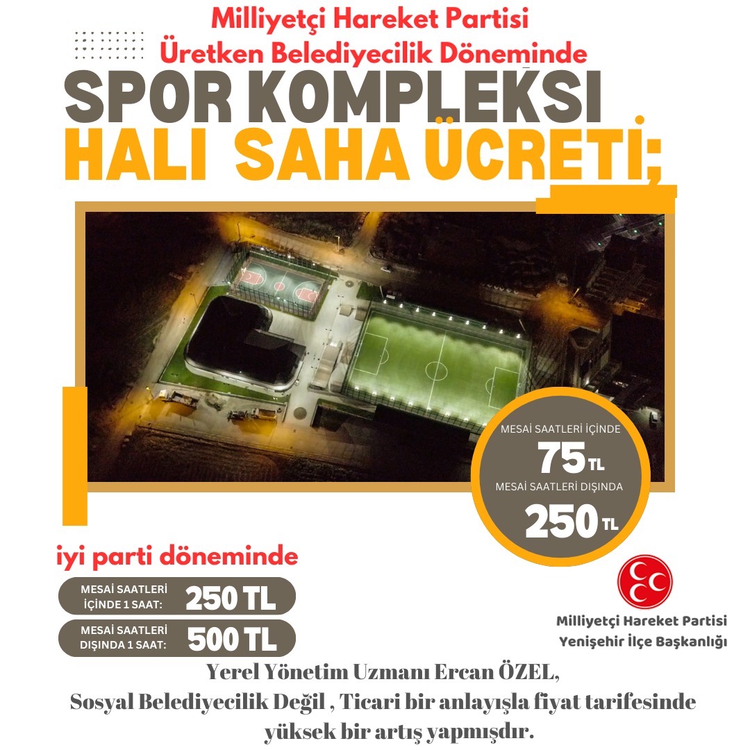 MHP’den yapılan açıklamada, ‘Sırtında yumurta küfesi yokken İlçemiz gündemini işgal eden her konuyla ilgili verdiği önerge ve dilekçeleri sosyal medya hesaplarında paylaşan Mevcut Belediye Başkanının göreve gelir gelmez yaptığı ilk icraatlardan birisi, Yenişehir Belediyemiz tarafından Yenişehir halkının hizmetine sunulan sosyal imkanlara % 600’e varan oranlarda zam yapmak oldu.
