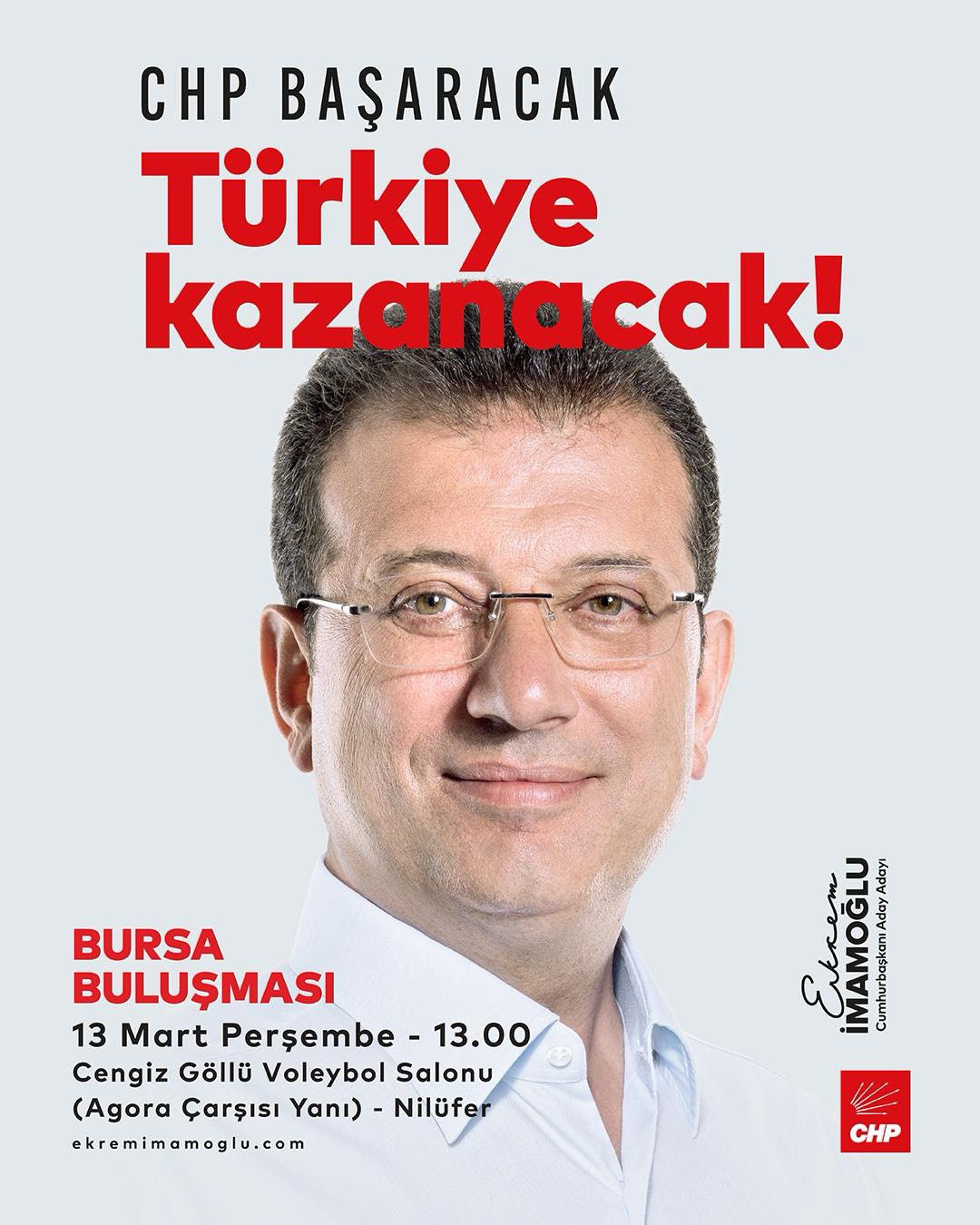 Bu seçime tek aday girmesi beklenen İstanbul Büyükşehir Belediye Başkanı Ekrem İmamoğlu, başlattığı yurt gezileri kapsamında 13 Mart’ta Bursalılarla buluşacak.
