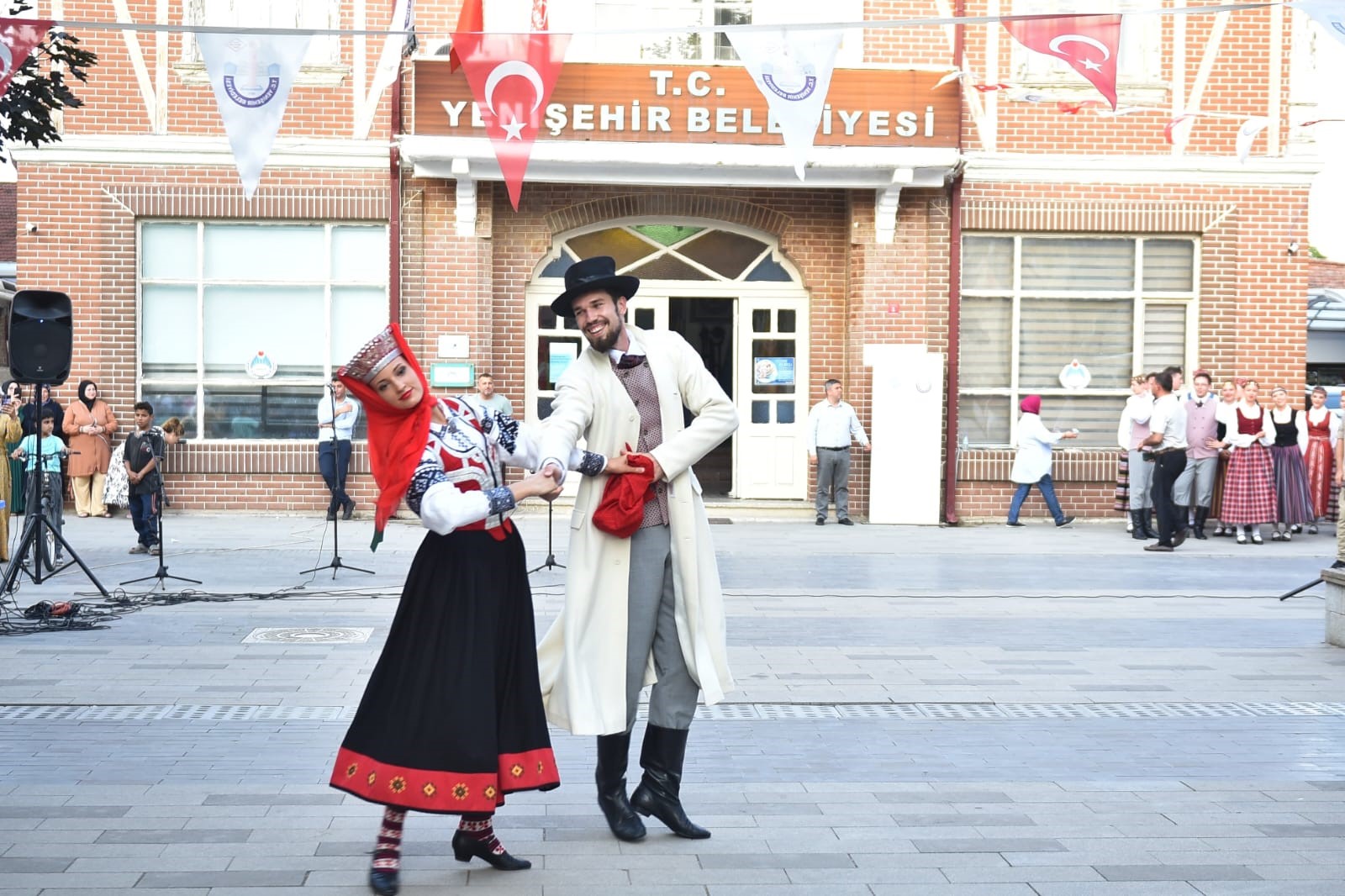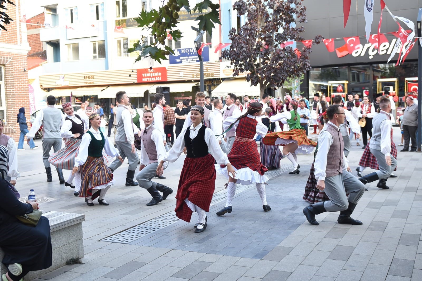 36’ncı Altın Karagöz Halk Dansları Yarışması’na katılan Letonya ve Kuzey Makedonya ekipleri Yenişehir’de Tarihi Belediye Binası önünde sahne aldı.