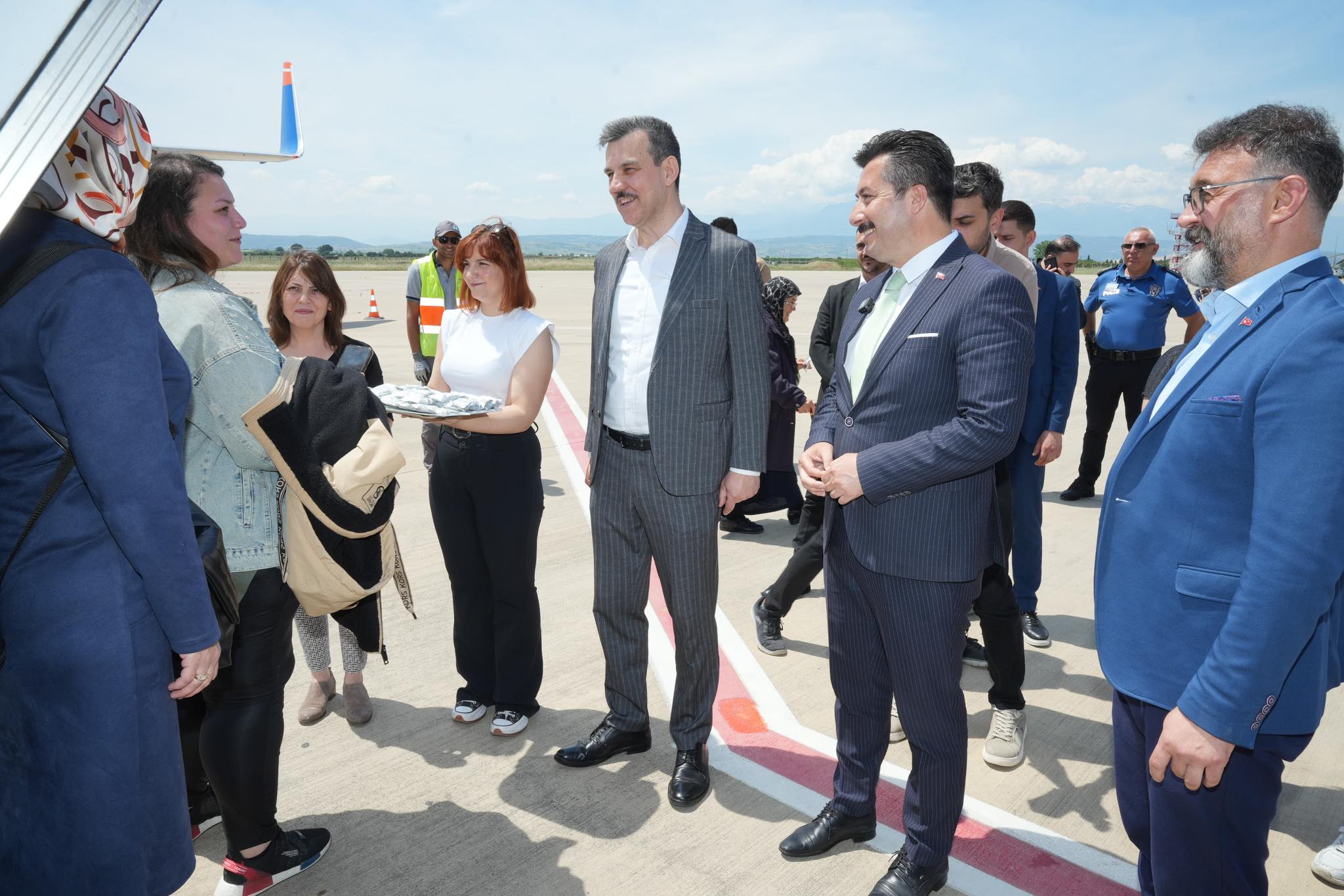 İki şehir arasında ilk kez yolculuk yapan uçuş ekibi ve yolcular, AK Parti Genel Merkez Teşkilat Başkan Yardımcısı ve Bursa Havayolu Ortak Girişimci Grubu Başkanı Mustafa Esgin, Yenişehir Belediye Başkanı Ercan Özel ve beraberindeki heyet tarafından karşılandı.