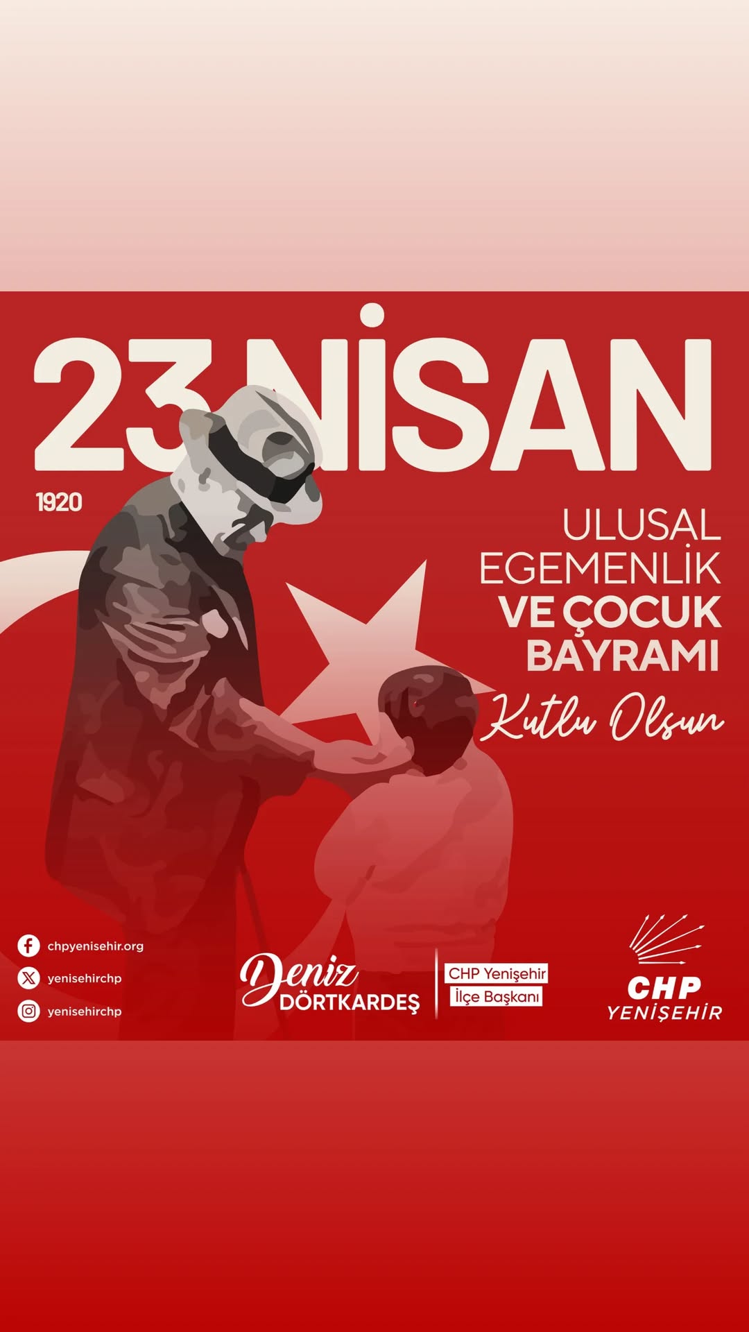 CHP Yenişehir ilçe başkanı deniz Dörtkardeş, 23 Nisan Ulusal Egemenlik ve Çocuk Bayramı nedeniyle bir mesaj yayımladı.